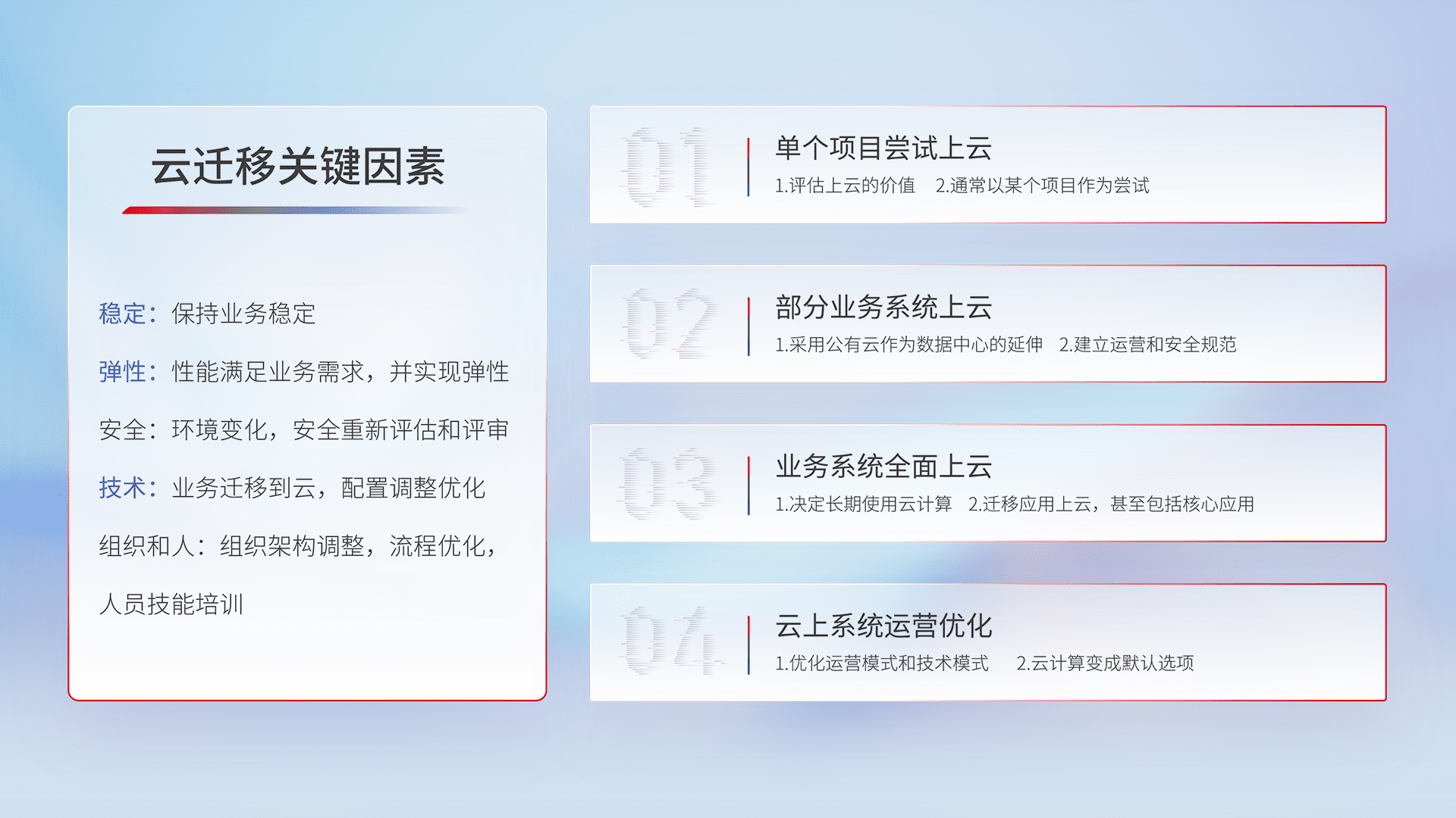 结合实际业务,,,,从规划设计、、、云平台选型、、云原生改造、、、数据迁移、、、、集成交付,,,,迁移全过程为客户识别最佳上云路径,,做好风险识别管理,,,,设计网络架构、、身份权限、、安全审计合规、、、、操作审计、、、日志审计、、、、监控告警策略、、、、多站点容灾设计等,,,对云上基础设施进行整体规划,,,提升IT治理水平,,,,以满足弹性、、、、高可用、、、高性能的需求。。。。