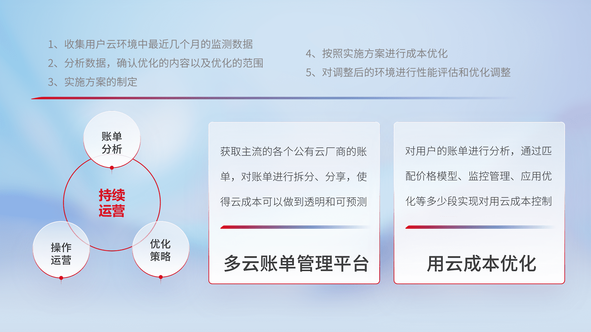 通过多云纳管,,,以统一的资源数据模型把客户的云资源进行抽象和封装,,,进而实现对多云资源的统一操作,,保障云资源管理的可靠性、、、、稳定性与可用性。。。。量身定制化运维内容,,,配置、、、、开发运维、、、补丁管理、、、、备份、、、监控、、、认证和访问管理、、审计和日常巡检等,,,保障在用云过程中的可靠度,,,,稳定度以及高可用率。。。。